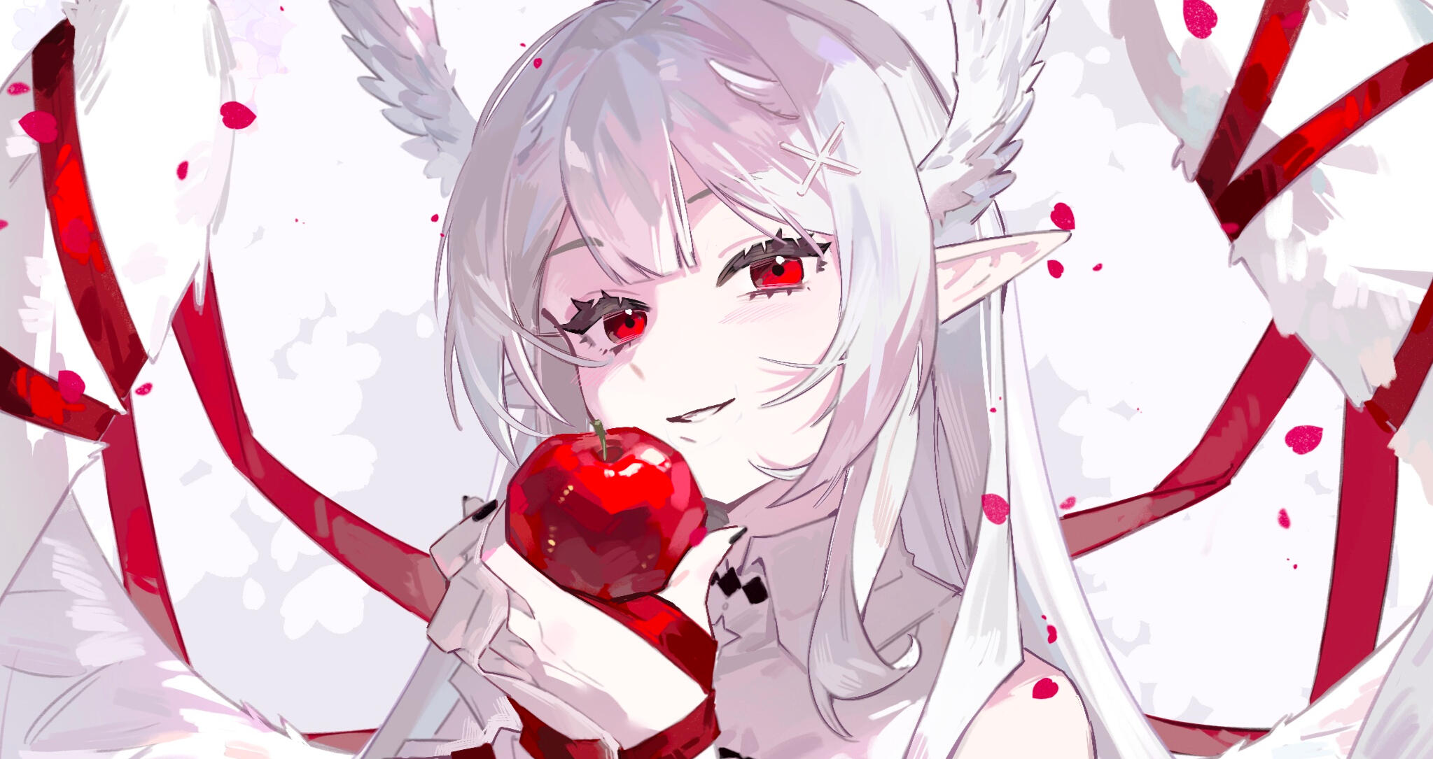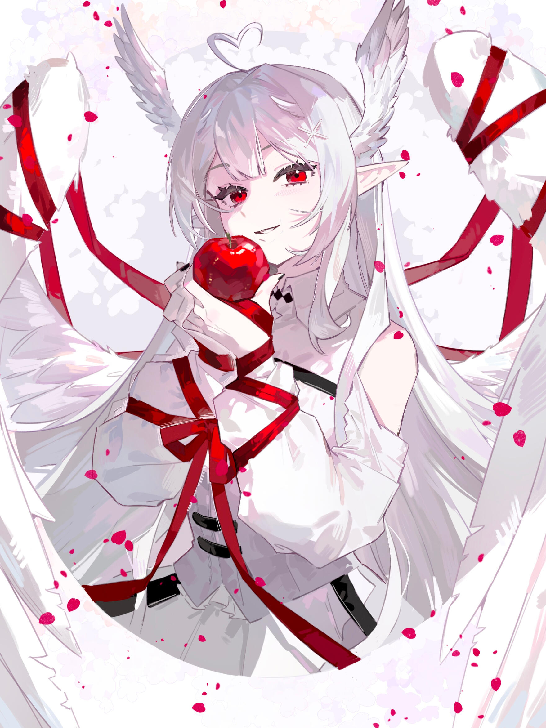✦ AppearanceKazeki prefers to have a clean and mature look about her. As a Seraph, she traditionally has a total of six wings: four on her head and two large white feathered wings on her back.Kazeki's prominent color scheme focuses around red, white, and black. She accessorizes with earrings, a choker, thigh high boots, belts, ruffles, lace, and silver adornments. She wears a black jacket with white faux fur when she wishes to add an extra layer.Her long, windswept, ashen white hair and red eyes were bestowed upon her due to the blood moon phase when she was created. Her long hair can get in the way of everyday tasks and she'll put her hair up in either a high ponytail or twintails.